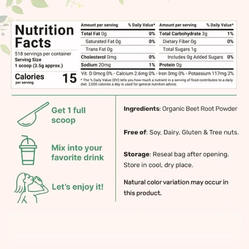 Our beet root powder has a mildly earthy, sweet flavor. You can mix it with water, juice, or add it to smoothies to enhance taste.